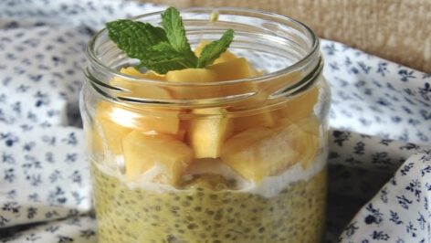 1. Fill a cup or jar with coconut milk, and add the chia seeds. The chia seeds will expand when they are mixed with the coconut milk.