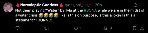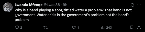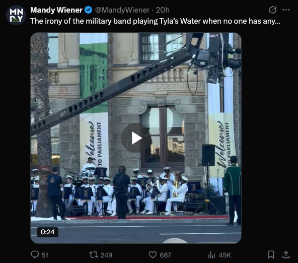 Investigative journalist Mandy Wiener noted the irony of the song during a time where multiple sections of Johannesburg have either had their water cut off – some for days or even WEEKS at a time – and grumbles of “Day Zero” on the horizon for Cape Town.