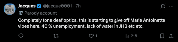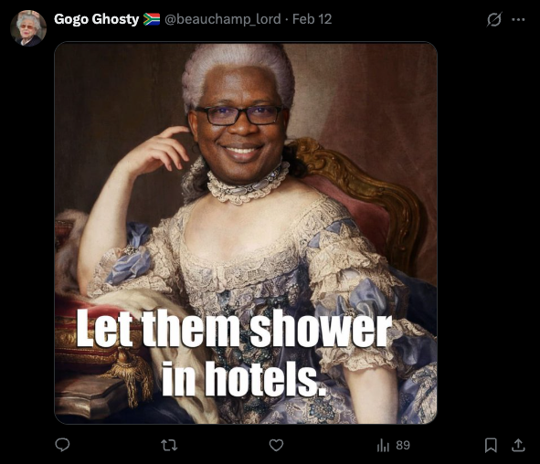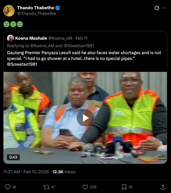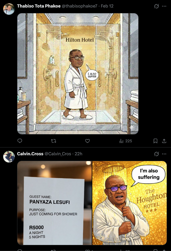 This would be an isolated incident if it didn’t feel like it was taking a leaf out of the book of Gauteng Premier, Panyaza Lesufi, who, while attempting to seem relatable during a discussion with angry Joburg residents, mentioned that he also struggled with the lack of water and would visit hotels to wash up.