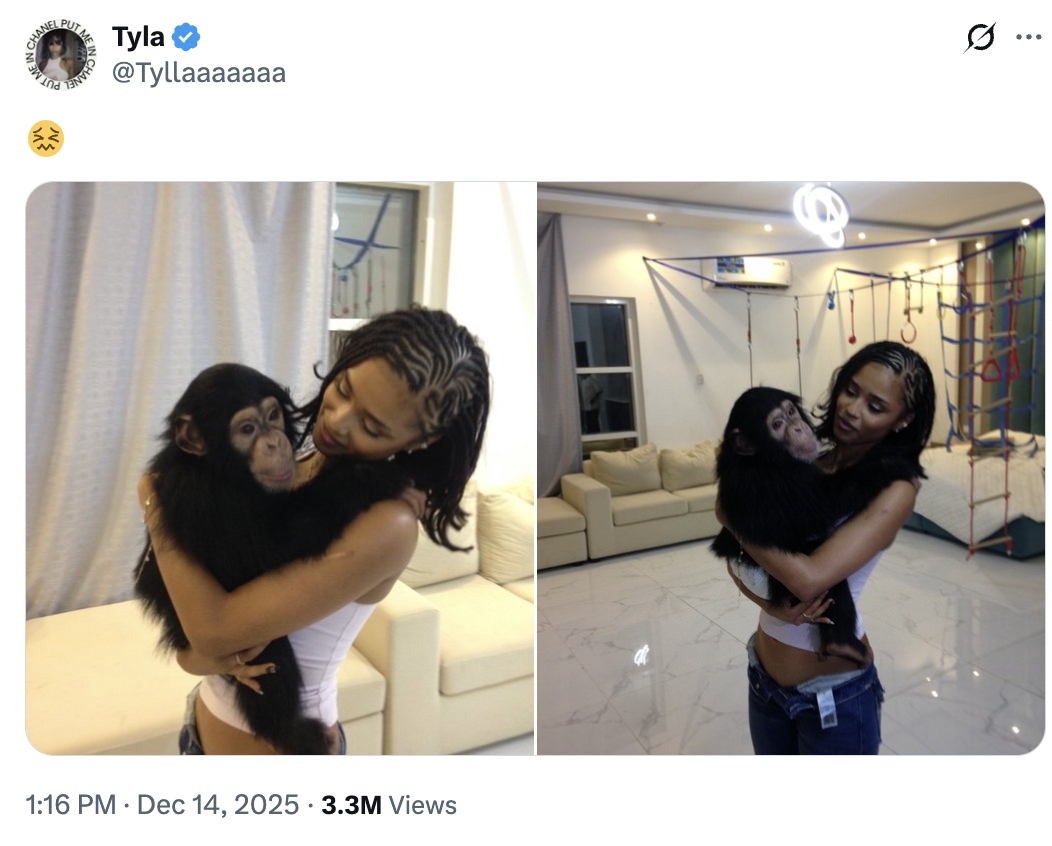 On Sunday, 14 December, the 23-year-old “CHANEL” hitmaker inexplicably shared two pics of her holding a chimpanzee on Twitter/X: