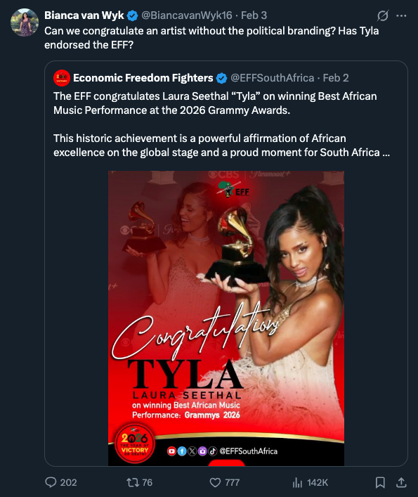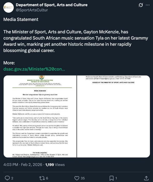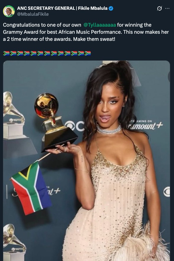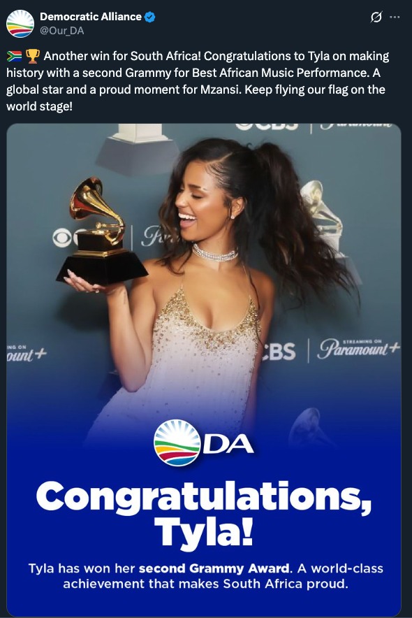 Tyla’s historic second win in the African Music Performance category at the 68th Annual Grammy Awards on Sunday night, 1 February, raised South Africa’s profile on the global stage, and Saffers celebrated all across the online lands… then the politicians showed up.