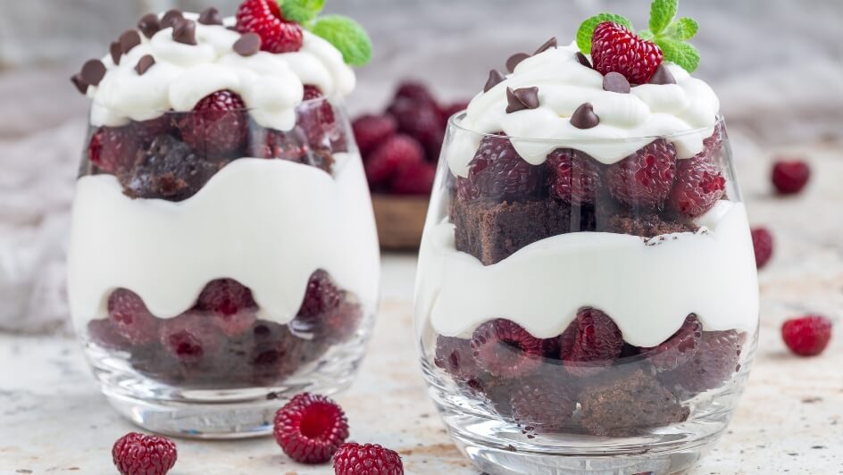 3. Add the chocolate mousse to a glass bowl as a base layer. Place the brownie squares on top of this base.